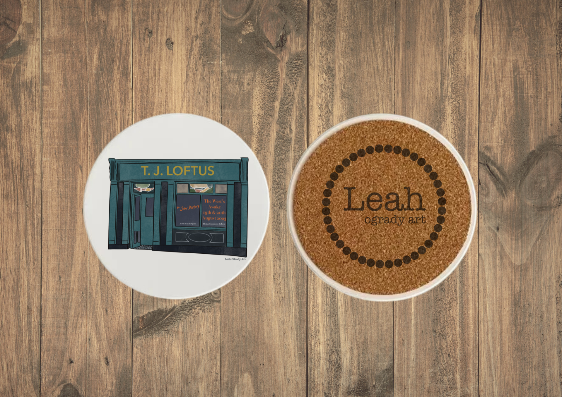 - Cork Backing Stamped with Leah OGrady Arts Logo.